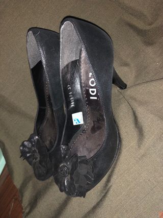 Elegantes zapatos de tacón de la marca LODI. - Color negro. - Talla 37. - Adorno floral en la punta. - Detalle de picado en la plantilla.