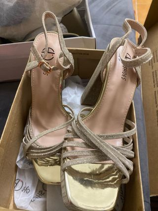 Elegantes zapatos de tacón con acabado brillante en color dorado. Perfectos para ocasiones especiales. - Talla 38. - Diseño con tiras cruzadas. - Tacón grueso y plataforma. - Cierre con hebilla.