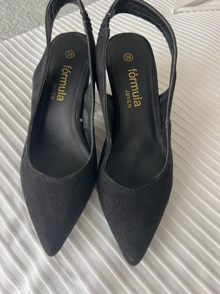 Elegantes zapatos de tacón negros con diseño de punta fina y tira en el talón. -cómodos -viene con embalaje original - Material exterior textil. - Forro interior. - Tira elástica en el talón para un ajuste seguro. - Solo usados una vez.
