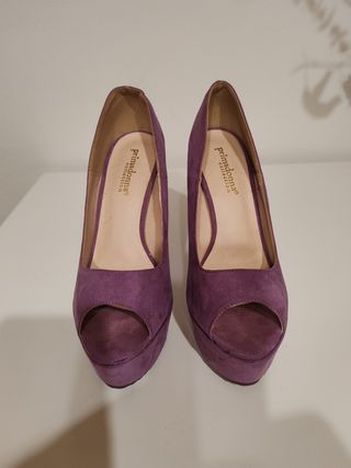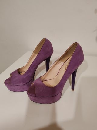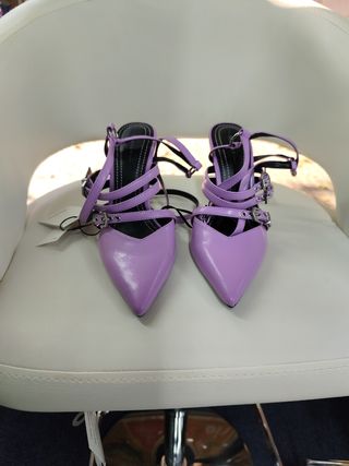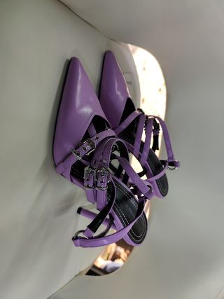 Preciosos tacones de color morado, ideales para cualquier ocasión. Son dos pares de zapatos. - Diseño de tiras cruzadas. - Hebillas metálicas. - Tacón fino. - Material: piel sintética (aparenta ser de buena calidad). - Están prácticamente nuevos.