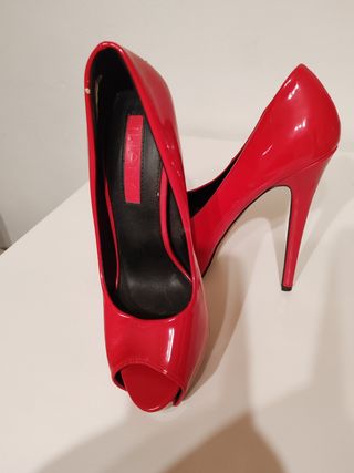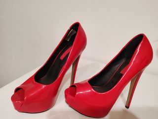 Preciosos zapatos de tacón alto, ideales para una ocasión especial. Son de color rojo y tienen un diseño elegante y sofisticado. - Tacón alto y fino. - Puntera abierta. - Material brillante.