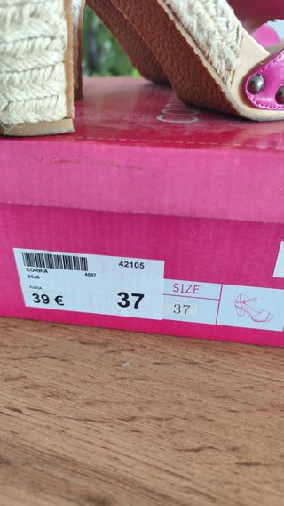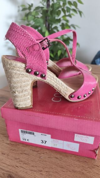 Preciosos zapatos de tacón de la marca Corina. Son de color rosa y talla 37. Están en buen estado. - Tacón de esparto. - Hebilla en el tobillo. - Detalles metálicos.