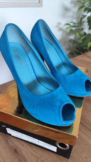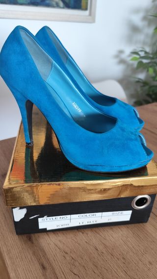 Preciosos zapatos de tacón aguja, color azul, talla 37. Son de ante y tienen un diseño elegante y sofisticado. Ideales para una ocasión especial. - Tacón alto y fino - Diseño peep-toe - Material: ante