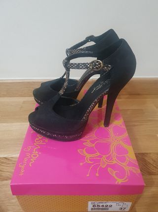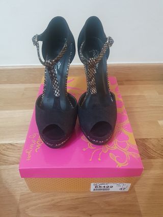 Preciosos zapatos talla 37, de color negro. Son de ante, con detalle de serpiente en la tira y plataforma. Ideales para ocasiones especiales. - Tipo: Sandalias de tacón - Material: Ante - Detalle: Tira con estampado de serpiente