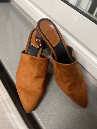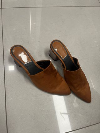 Preciosos mules de tacón bajo de Stradivarius. Son de color marrón y tienen un diseño elegante y sofisticado. - Material: ante sintético. - Tacón: bajo y cómodo. - Punta: fina y estilizada. - Perfectos para cualquier ocasión. -Talla 39
