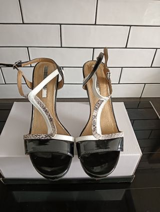 Elegante par de zapatos de tacón alto. Ideales para ocasiones especiales. - Diseño de tiras con estampado de serpiente. - Tacón fino y elegante. - Color negro y blanco.