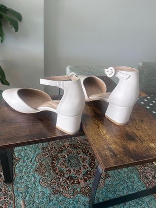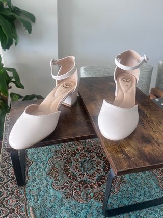 Preciosos zapatos de tacón, ideales para una fiesta o ceremonia. Son de color champán y tienen un diseño elegante y sofisticado. - Número 39 - Tacón cómodo y estable. - Diseño cruzado en el empeine. - Material brillante y atractivo. - Perfectos para cualquier ocasión especial. - Un sólo uso.