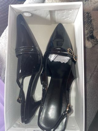 Elegantes zapatos de tacón destalonados con un diseño moderno. - Acabado brillante. - Detalle de hebilla metálica en la punta. - Correa ajustable en el talón.
