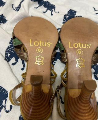 Zapatos dorados, cerrados, con pequeño tacón (4 cms.) Y lazo en la parte del empeine. Son nuevos.
