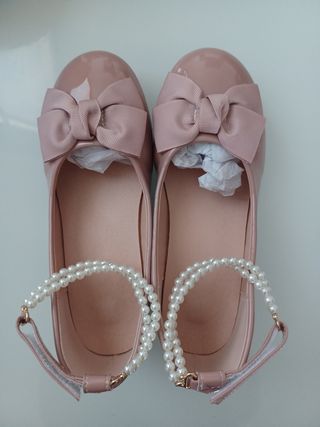 Bonitos zapatos de charol para niña talla 34,miden 22cm con tacón de 2,5 cm un delicado lazo y detalle de perlas. - Color rosa pálido. - Cierre de pulsera con perlas. - Adorno de lazo en la punta.