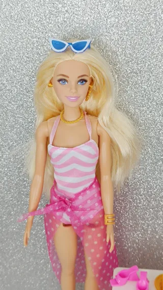 Conjunto de Barbie con temática de verano y glamour, listo para la playa o la piscina. Incluye varios accesorios. - Barbie con traje de baño rosa y blanco. - Pareo rosa con lunares blancos. - Gafas de sol azules. - Bolso de playa rosa. - Cepillo para el pelo. - Cono de helado. - Zapatos de tacón rosas. - Sombrero de ala ancha rosa. - Revistas de moda Barbie y Vogue.