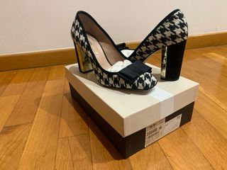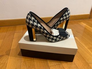 Elegantes zapatos de tacón de Hannibal Laguna. - Diseño de pata de gallo en blanco y negro. - Tacón grueso con detalle dorado. - Adorno de lazo en la punta.