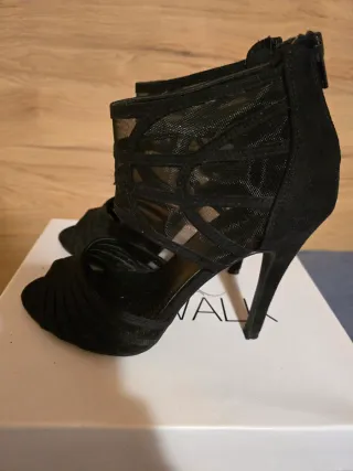 Elegantes tacones negros con un diseño moderno. - Acabado en ante. - Detalle de tiras cruzadas en la parte delantera. - Panel de malla en la parte superior. - Cierre de cremallera en el talón. - Pequeño desgaste en la malla delantera del pie derecho.