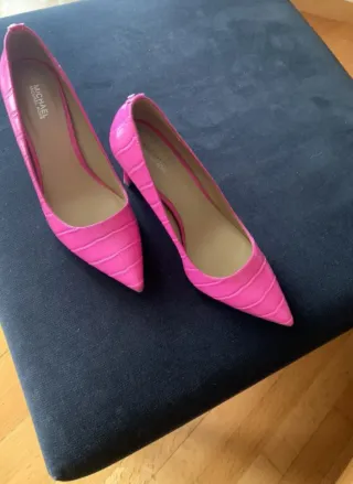Elegantes zapatos Michael Kors de piel vegana en un vibrante color rosa. Cuentan con un tacón medio y un diseño de punta afilada. Vendo porque me gustan tonos más discretos. Si quieres darle un toque de color a un look más clásico, son todo un acierto. - Material: Piel vegana con discreto estampado cocodrilo - Tipo de tacón: Medio. - Diseño: Punta. - Estado: Sin uso.
