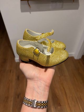 Preciosos zapatos dorados para niña con acabado brillante. - Diseño con tira y hebilla. - Detalle de glitter en toda la superficie. - Ideales para ocasiones especiales. Zapatos de tacón de disfraz o sevillana para niña sin estrenar. Solo se usaron para una foto en interior. Suela impoluta, solo un poco de desgaste en la tira a consecuencia de la hebilla imperceptible. Talla 23. Precio original 25€. #Talla23