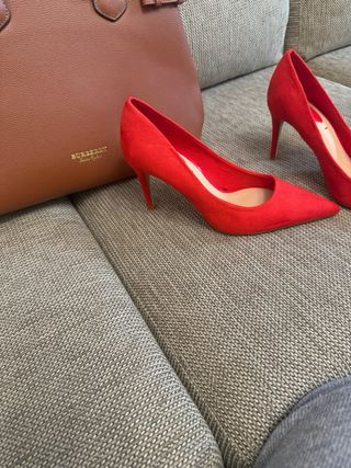 Calzado de mujer, de tacón, confeccionado en ante de color rojo con un detalle de hebilla de cadena metálica en la parte delantera, se caracteriza por su suavidad y su tacto aterciopelado. Es un material muy común en el diseño de calzado, que aporta un toque elegante y suave. Poco uso, precio negociable😊