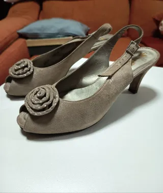 Elegantes zapatos de tacón con detalle de flor, en piel ante. Solo puestos una vez en una boda. Con su caja original, donde se puede ver el precio de 168€. Puestos una sola vez en una boda. - Color beige. - Talla 40 - Tira ajustable al tobillo.
