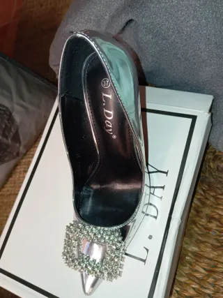 Elegantes zapatos de tacón plateados, usados una sola vez. - Diseño brillante con pedrería en la pala. - Tacón fino y alto.