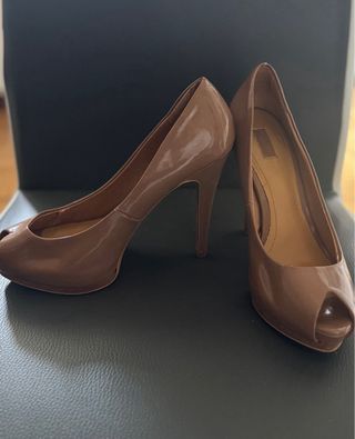 Elegantes zapatos de tacón de charol de la marca ZARA. - Color marrón. - Diseño peep toe. - Talla 38.