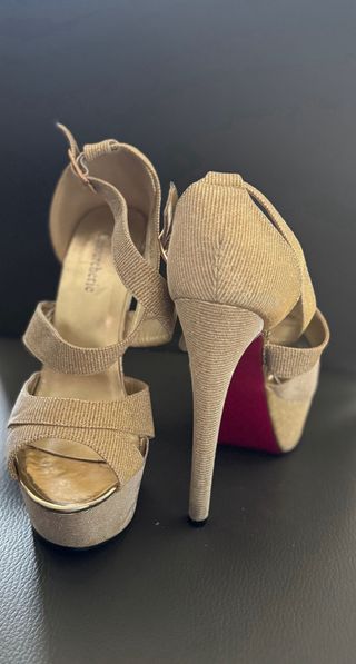 Elegantes zapatos de tacón con acabado brillante en color dorado. Perfectos para ocasiones especiales. - Diseño de tiras cruzadas. - Plataforma delantera. - Cierre de hebilla. - Talla 37. - Tacón 15CM