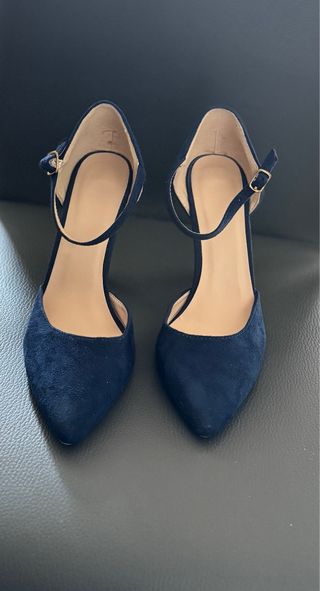 Elegantes zapatos de salón de la marca Cortefiel. - Tacón medio. - Diseño de punta fina. - Material de ante. - Azul marino. - Talla 38 en Europa, 7,5 UK, 24 MEX Prácticamente sin usar.