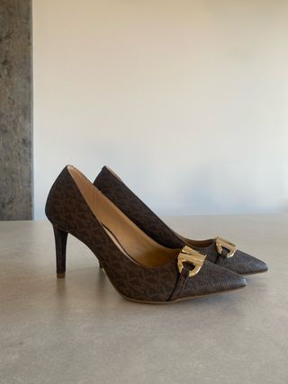 Elegantes zapatos de tacón Michael Kors con un diseño clásico y un detalle distintivo. - Estampado de monograma en tono marrón. - Adorno metálico dorado en la punta. - NUEVOS