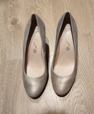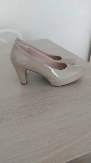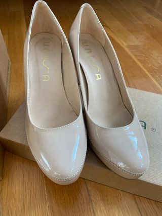 Elegantes zapatos peep toe de la marca Unisa, en color nude y talla 38. Charol. Han sido usados en una ocasión muy poco rato y se encuentran en perfecto estado. - Diseño peep toe. - Cierre con pulsera al tobillo. - Tacón fino.