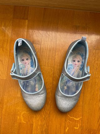 zapatitos de tacón en color azul con purpurina para disfrazarse o jugar a ser mayor. son del número 31. son de Elsa de Frozen. están en bastante buen estado, con algún desgaste cerca de la hebilla.