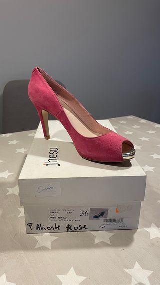 Elegantes zapatos de tacón de ante, perfectos para eventos especiales. El diseño combina un color rosa con detalles dorados en la punta. Usados una sola vez, están como nuevos. - Modelo: Ante Fresa - PVP: 64,95 €
