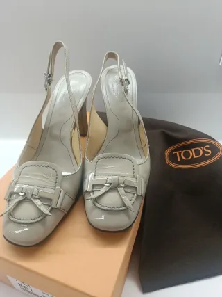 Elegantes zapatos de tacón abierto de la marca Tod's. - Diseño en charol beige - Detalle de lazo y hebilla metálica. - Correa ajustable al tobillo.