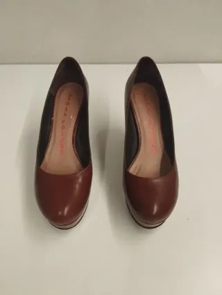 Elegantes zapatos de piel con plataforma y tacón. Utilizados solo una vez por una modelo para el catálogo de mobiliario de decoración .Interior de plantilla 22,5 x 7,5 Tienen una pequeña marca que se puede ver en la imagen - Material exterior de piel interior también forrado en piel - Diseño de plataforma forrada en charol color más claro de 2,5 cms de altura - Tacón alto de 10 CMS