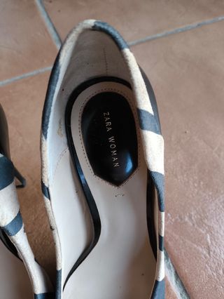 Preciosos zapatos de tacón de Zara. Son de color beige y negro con un diseño de rayas. -Punta fina. -Tacón alto. -En buen estado. Se venden en pareja.