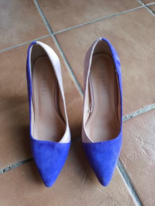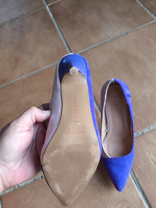Preciosos zapatos de tacón de la marca Marypaz. Son de color beige y morado, y de la talla 37. - Diseño bicolor elegante. - Tacón fino. -Punta estrecha. - Material tipo ante.