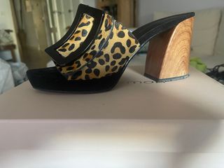 Preciosos zapatos de tacón de la marca Noa Harmon. Son de color marrón y negro con estampado de leopardo. - Diseño de zueco con hebilla. - Tacón de madera. - Están en perfecto estado.