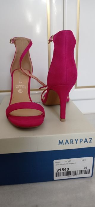 Sandalias de tacón de la marca MARYPAZ, en color rosa y talla 40. Son de charol y tienen un diseño elegante y sencillo. un solo uso - Tacón grueso y cómodo. - Hebilla de cierre. - Perfectas para cualquier ocasión