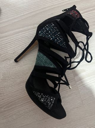 Elegantes zapatos de tacón alto con un diseño de tiras y cordones. - Acabado en ante negro. - Detalles de tejido multicolor. - Tacón de aguja.