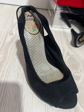 Zapatos de antelina color negro con cordones para ajustarlo a tu pie. Tiene un tacon de 4cm ya q se compensa con la plataforma Número 35 y están sin estrenar
