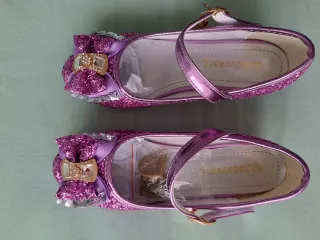 Preciosos zapatos de purpurina para niña con un pequeño tacón. - Color morado brillante. - Adorno de lazo con pedrería. - Cierre de velcro. - Talla 33.