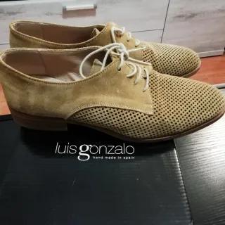 Elegantes zapatos de ante con un diseño perforado. - Material: Ante. Muy cómodo. Parte delantera con agujeros. Ideal para que transpire. -Está usado, pero muy cuidado y en buen estado. -La suela se ve usada, pero tacón y planta de pie perfectos. - Color: camel - Cierre: Cordones - Marca: Luis Gonzalo - Fabricación: Hecho en España. - Me costaron 89 euros. Los vendo en 17