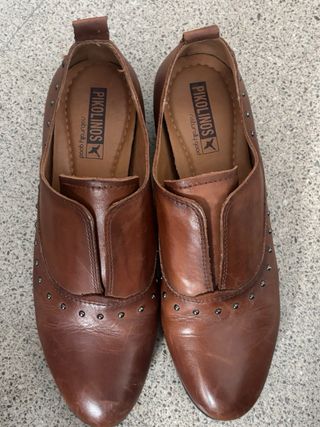 Elegantes zapatos Pikolinos de cuero en color marrón. - Diseño tipo mocasín con detalle de tachuelas. - Piel flexible y cómoda. - Tacón bajo para mayor confort.