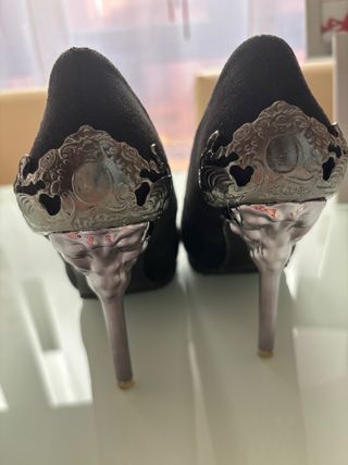 Elegantes zapatos de tacón con un diseño único. - Combinación de materiales en negro y dorado. - Correa de ajuste con hebilla. - Detalle de pespuntes en la puntera. Lo único que tiene un poco desgastado es el velcro que los ata. Las suelas están nuevas.