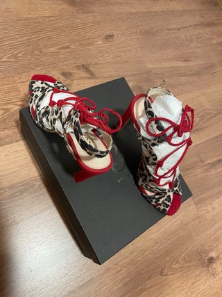 Elegantes zapatos de tacón Lodi con un llamativo estampado de leopardo y detalles en rojo. - Diseño de tiras con lazada. - Tacón de aguja. - Acabado en ante. 1 sola puesta ideales para estos días de Navidad