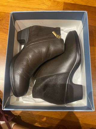 Elegantes botines de tacón en color marrón. Cuentan con un diseño moderno y práctico. - Cierre de cremallera lateral dorada. - Detalle de textura en la parte superior. - Tacón grueso y cómodo.