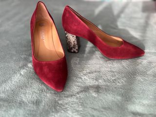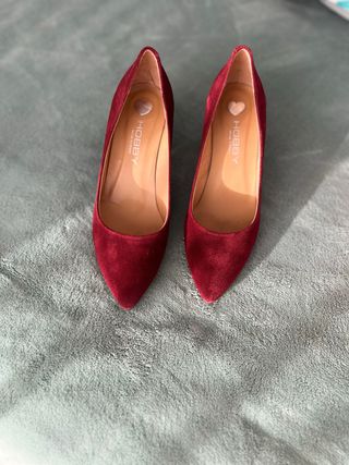 Elegantes zapatos de tacón Hobby en color granate. Un clásico que no puede faltar en tu armario. - Material exterior de ante. - Diseño de punta fina. - Pequeño detalle de corazón en la plantilla. - Fabricados en España.