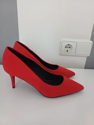 Elegantes zapatos de tacón de Zara en color rojo. - Diseño de punta afilada. - Tiras cruzadas en el empeine. - Cierre con hebilla. - Acabado brillante. Pago solo en efectivo, entrega en persona, en Valladolid.
