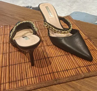 Elegantes zapatos de tacón de Primark. - Diseño destalonado. - Tira con detalle de cadena dorada. - Punta fina.