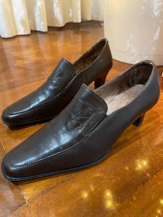Elegantes zapatos de tacón en color marrón. Un diseño clásico con un toque moderno. Muy poco uso; tapas y suelas en perfectas condiciones. Piel auténtica. Envio o entrega en Vigo - Tacón grueso y estable. - Cierre de cordones. - Detalle de picado decorativo.