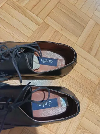 Zapatos de cordones de la marca Dustin. - Modelo: 81610 - Color: Negro - Talla: 40 - Referencia: 041 00195 Zapatos de piel tanto en el exterior como en el interior y la plantilla, la suela es de goma. Piel muy flexible, lo que les hace muy cómodos. Están en buen estado aunque han sido utilizados; su interior está impecable. En la venta NO están incluidos los pernitos de madera que se ven en las fotos y con los que han estado siempre conservados en su caja.