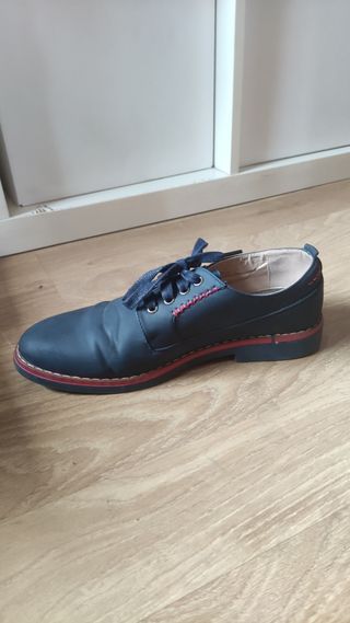 Vendo un par de zapatos de cordones. Son de color azul marino y tienen un diseño elegante. - Marca : kalasity - Material: Piel - Cordones de color azul marino con pespuntes rojos. - Suela de goma. - En perfecto estado.