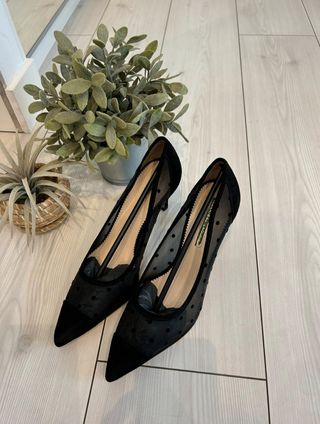Elegantes zapatos de tacón con un diseño de lunares. - Material de malla con lunares negros. - Punta y talón en ante. - Tacón de aguja.